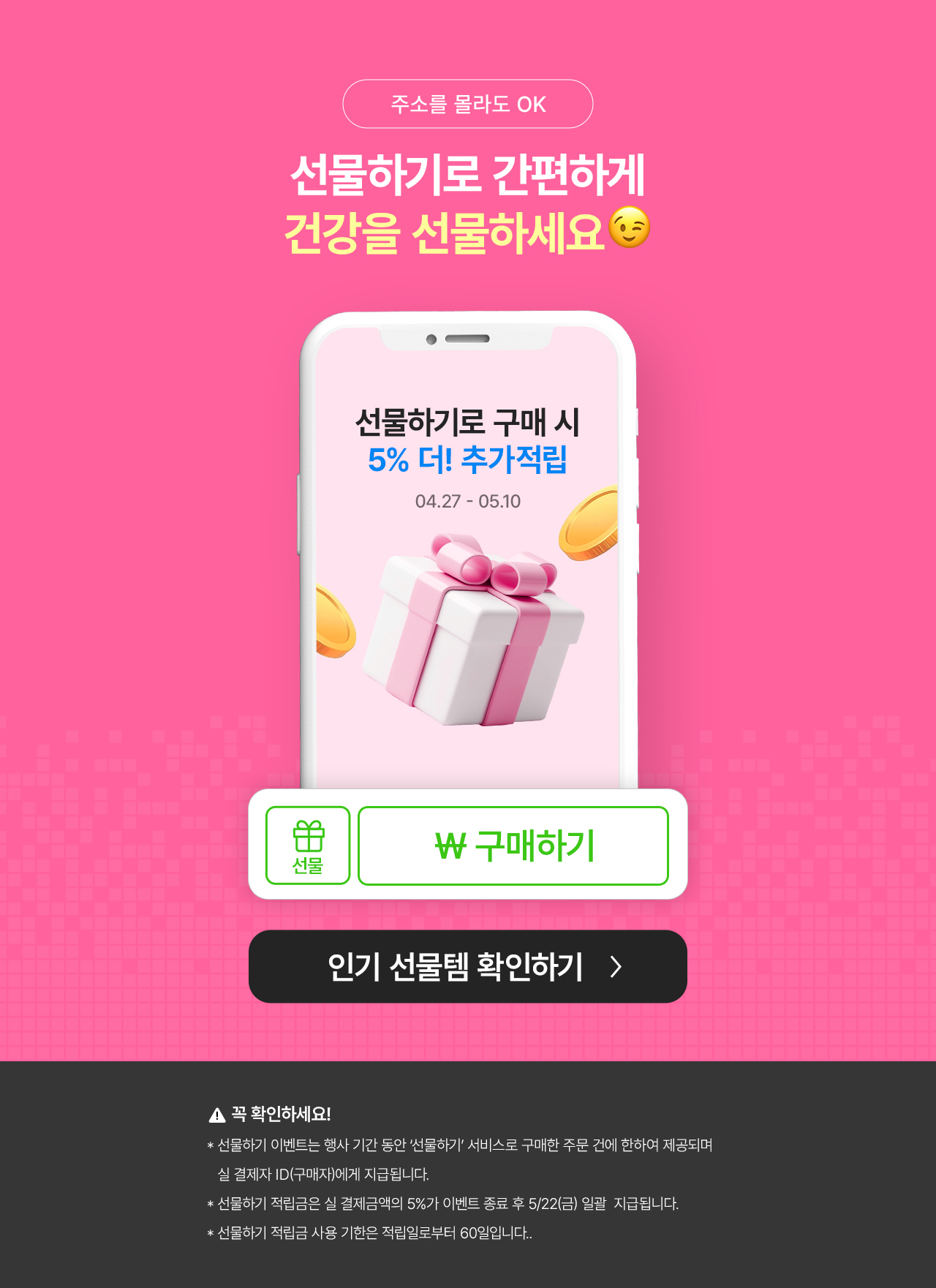 - ์ด๋ฒคํธ ๊ธฐ๊ฐ: 4/27~5/10 โ ๊ธฐ๊ฐ ๋ด ๋งค์ผ 1์ผ 1ํ ์ฐธ์ฌ ๊ฐ๋ฅํฉ๋๋ค.