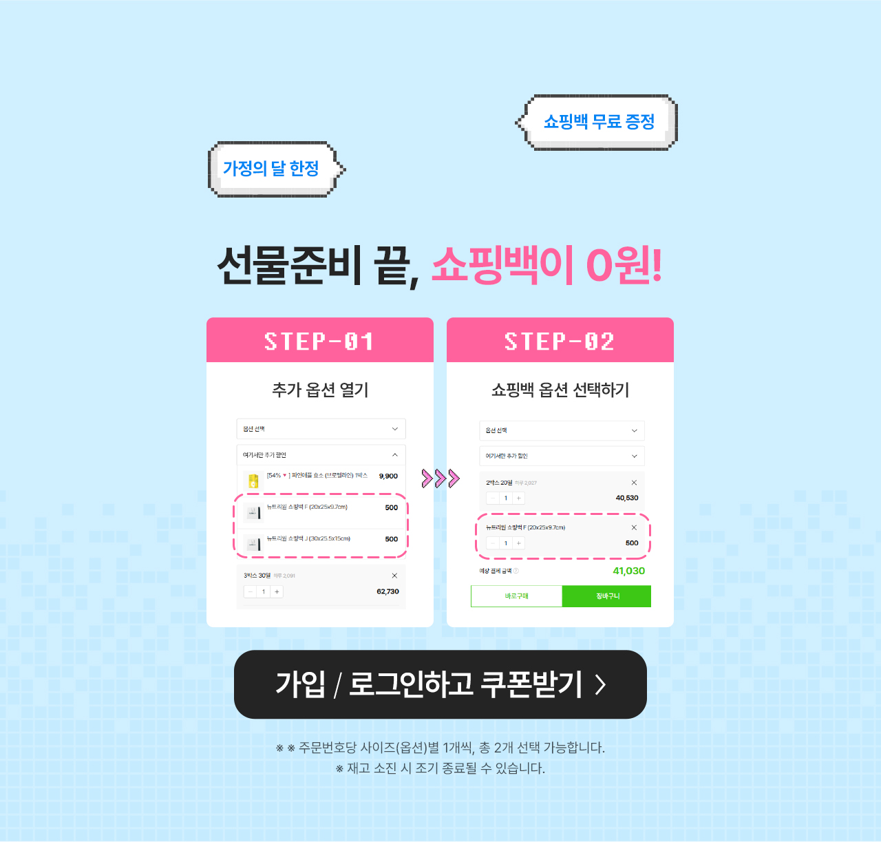 - ๋ณธ ์ด๋ฒคํธ 15/20% ์ฅ๋ฐ๊ตฌ๋ ์ฟ ํฐ 2์ข ์ ๊ฐ์ /๋ก๊ทธ์ธ ์ ๋งค์ผ ์๋ ๋ฐ๊ธ๋๋ฉฐ, ๋ฐ๊ธ ๋น์ผ๊น์ง ๋ฏธ ์ฌ์ฉ ์ ์๋ ์๋ฉธ๋ฉ๋๋ค.