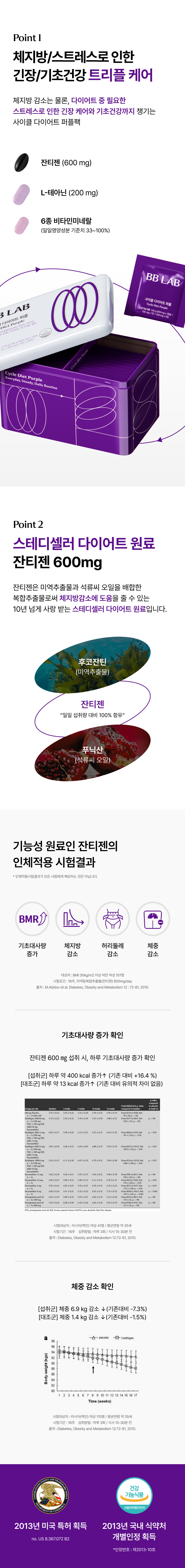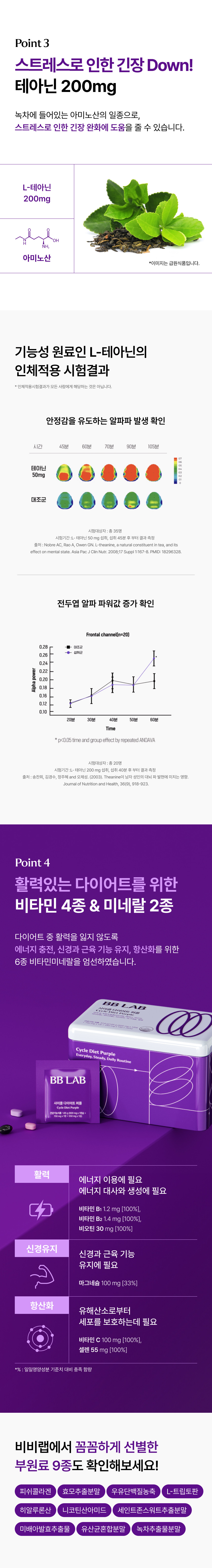 기능정보 | * 혈당컷 다이어트 [녹차추출물] 항산화·체지방 감소·혈중 콜레스테롤 개선에 도움을 줄 수 있음 [바나바잎 추출물] 식후 혈당상승 억제에 도움을 줄 수 있음 * 사이클 다이어트 퍼플 [미역 등 복합추출물(잔티젠)] 체지방 감소에 도움을 줄 수 있음 [테아닌] 스트레스로 인한 긴장완화에 도움을 줄 수 있음 [마그네슘] 에너지 이용에 필요. 신경과 근육 기능 유지에 필요 [비타민C] 결합조직 형성과 기능유지에 필요. 철의 흡수에 필요. 항산화 작용을 하여 유해산소로부터 세포를 보호하는데 필요 [셀렌] 유해산소로부터 세포를 보호하는데 필요 [비오틴] 지방, 탄수화물, 단백질 대사와 에너지 생성에 필요 [비타민B1] 탄수화물과 에너지 대사에 필요 [비타민B2] 체내 에너지 생성에 필요 |